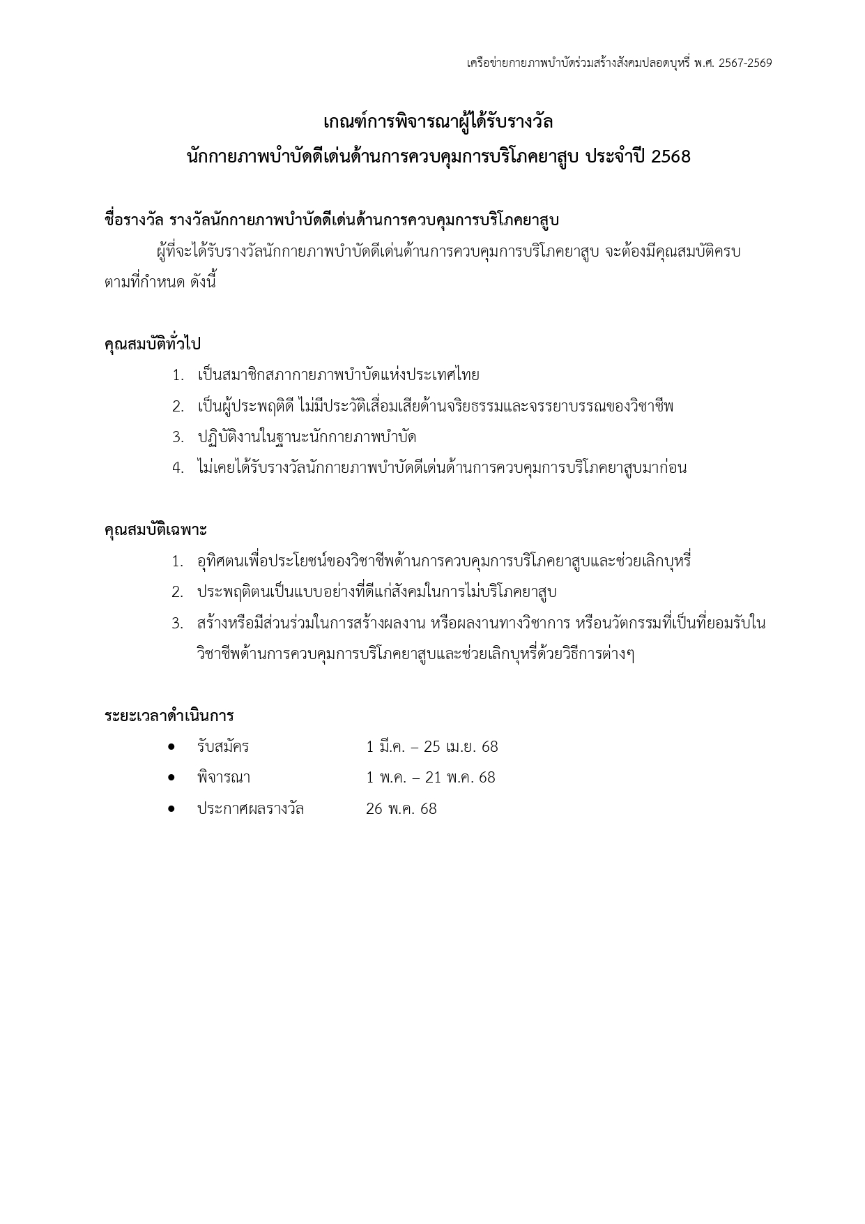 เกณฑ์การพิจารณาผู้ได้รับรางวัล นักกายภาพบาบัดดีเด่นด้านการควบคุมการบริโภคยาสูบ ประจำปี 2568